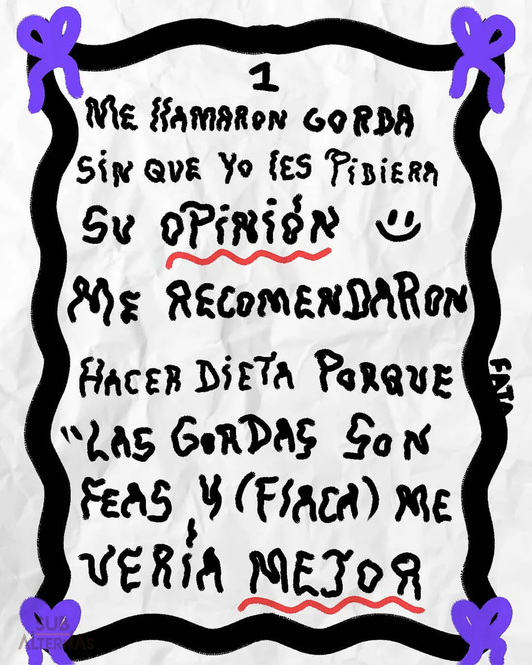 Hoy me llamaron gorda, fea y cerda, sin yo preguntarles, sin pedirles su opinión acerca de mi cuerpo. Me llamaron gorda y por un segundo me lo creí. Me mandaron a hacer dieta, ejercicios, a bajar mi enorme panza, a tener menos tetas, menos grasa. Hablaron y hablaron de mí como si yo no estuviera allí.
